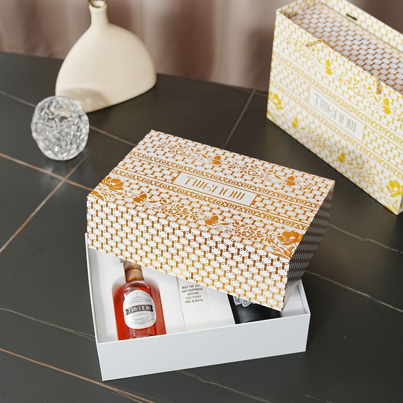 Lasciati sedurre dalla purezza di un momento sensoriale con il Cofanetto Essenza. Un duo raffinato per creare un’atmosfera calda e avvolgente, presentato in un elegante astuccio dorato. Pensato per valorizzare gli interni, questo cofanetto è ideale da regalare o da concedersi.